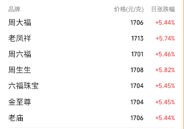 最直接的是,国内金饰价格已颠覆消费者的心理预期,1700元/克的高位让购买者与观望者均产生观望情绪。其中,老凤祥为1713元/克,单日上涨93元/克;周生生为1708元/克,单日上涨94元/克。